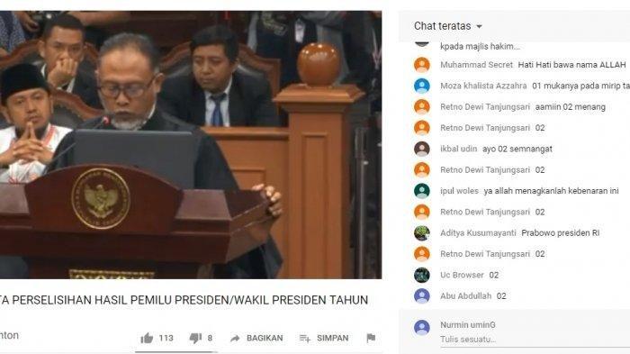 Dituliskan dalam gambar grafis laman resmi MK "Ikuti Live Persidangan PHPU Presiden/Wakil Presiden di Kanal Youtube Mahkamah Konstitusi RI".