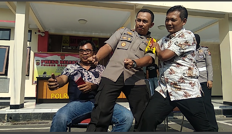 Peragaan tersebut ia lakukan saat konferensi pers dengan awak media di kantor Satreskrim Polres Majalengka, Jumat (21/6/2019).