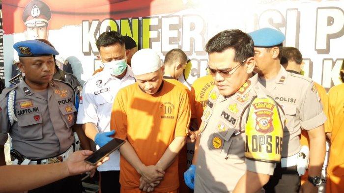 TRIBUNCIREBON.COM, CIREBON - Pria berinisial DA (39) tampak tertunduk saat konferensi pers di Mapolres Cirebon Kota, Jalan Veteran, Kota Cirebon, Jumat (25/10/2019).