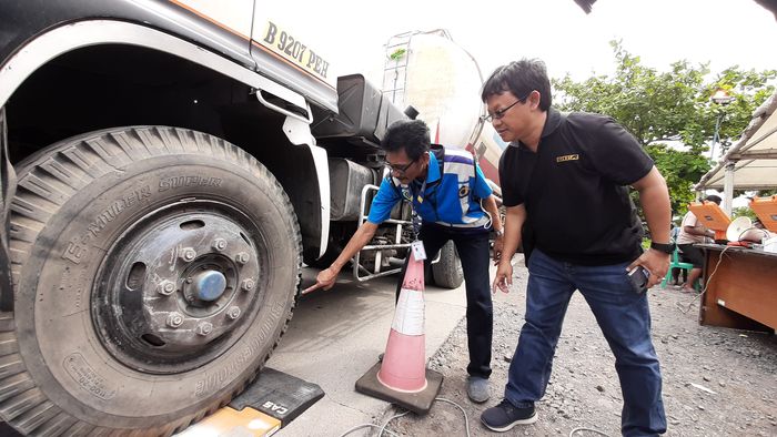 Dalam kesempatan itu, Dwi Triono terlihat mengecek kondisi ban setiap kendaraan besar yang diperiksa petugas gabungan.