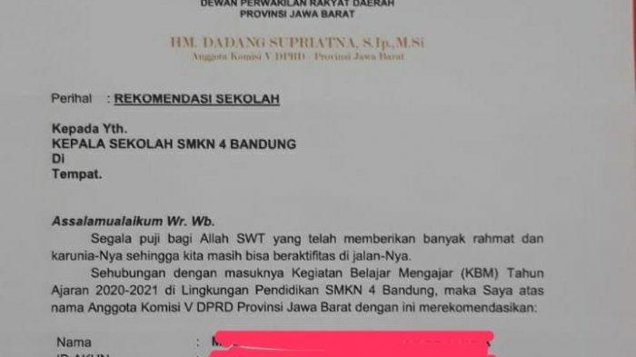 Sebelumnya, Anggota DPRD Jabar, Dadang Supriatna, membenarkan jika foto surat yang beredar di media sosial perihal rekomendasi sekolah yang ditujukan kepada Kepala SMKN 4 Bandung, dengan kepala surat yang mencantumkan nama dirinya sebagai anggota dewan, ditulis oleh dirinya.