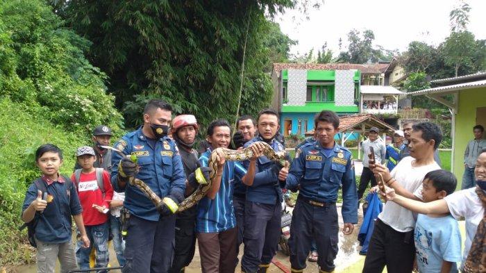 TRIBUNCIREBON.COM, SUMEDANG - Warga Dusun Pasigaran, RT 1/4, Desa Pasigaran, Kecamatan Tanjungsari, Kabupaten Sumedang digegerkan dengan penemuan seekor ular Sanca Batik yang menggantung di pohon jambu, Rabu (24/2/2021).