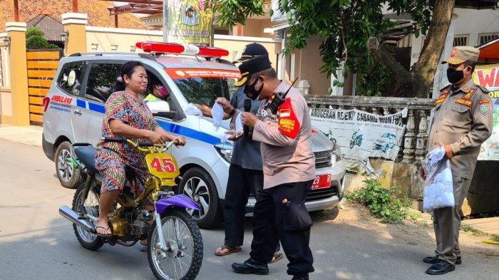 Petugas kepolisian ditemani petugas kesehatan Puskesmas Losarang turun ke jalan mensosialisasikan agar masyarakat mematuhi protokol kesehatan.
