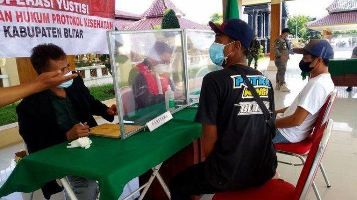 Masker dia pakai, tapi hanya di dagu. Dia pun harus menjalani sidang tindak pidana ringan dengan diadili oleh hakim Satdiadi dari Pengadilan Negeri Blitar.