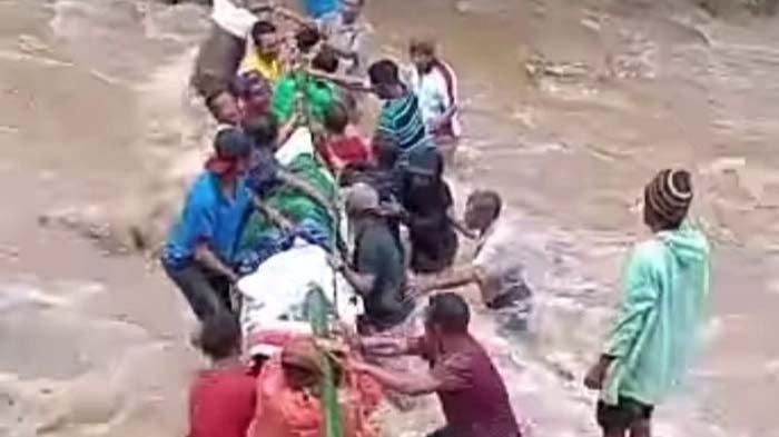 Puluhan warga menggotong jenazah menyeberangi arus sungai itu terjadi di Manggarai Barat, NTT.