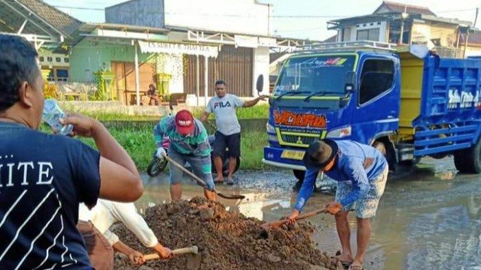 Mereka memperbaiki jalan berlubang dengan melakukan penambalan secara swadaya.