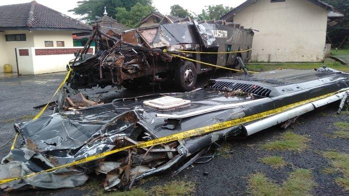 Bangkai bus maut yakni bus pariwisata Citra Trans Utama yang masuk jurang di jalan Raya Rajapolah, Tasikmalaya, kini diamankan di Mapolsek Rajapolah.
