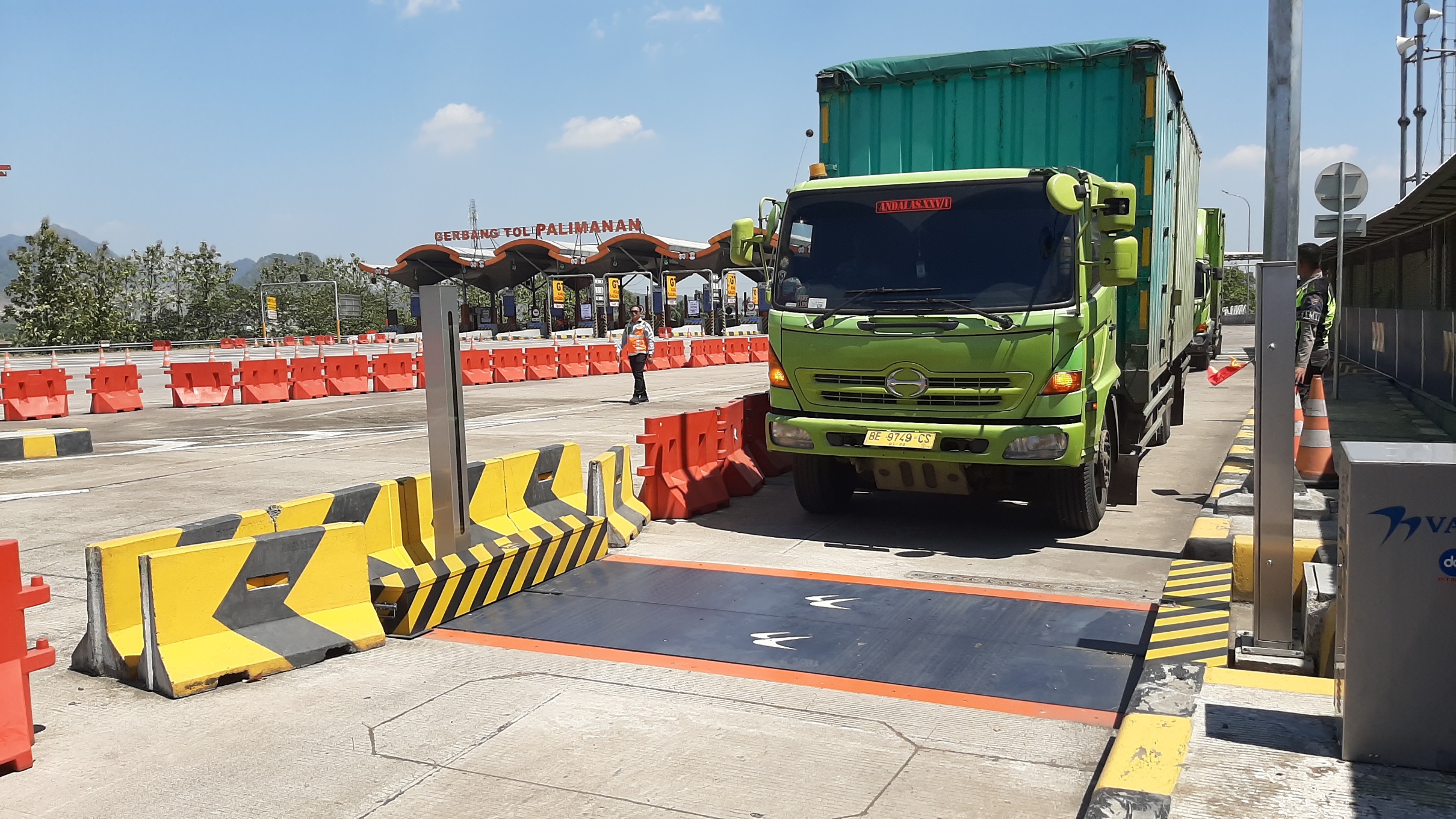 Para petugas juga tampak menggunakan alat Wight in Motion (WIM) yang merupakan milik PT LMS untuk mengukur dimensi dan berat muatan truk besar yang melintasi GT Palimanan.