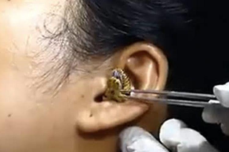 seekor ular berwarna kuning tersangkut di telinga seorang wanita, begini penanganan dokter