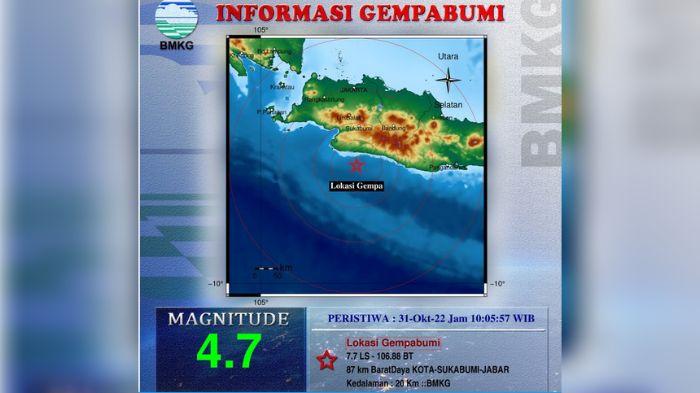 Pusat gempa bumi berada di laut, 87 kilometer barat daya Kota Sukabumi.