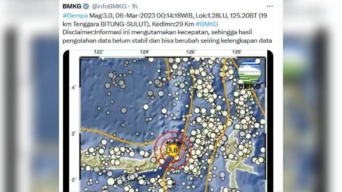 Dua Gempa Melanda Sulawesi Malam Tadi, di Morowali Lalu di Bitung, Ini Unggahan BMKG