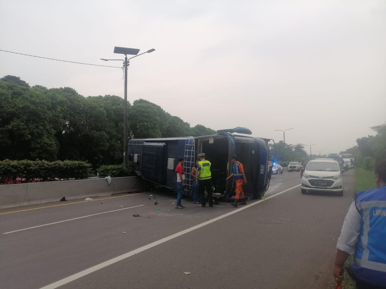 Akibat kecelakaan tersebut, ia mengatakan, bus terbalik dengan posisi ban kiri berada diatas dan menutup lajur satu dan dua.