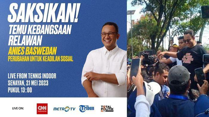 Calon Presiden Anies Baswedan bakal menemui ribuan relawannya di Tenis Indoor Senayan, Jakarta Pusat, Minggu (21/5/2023), dalam acara temu kebangsaan.