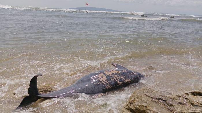 Ia menduga, lumba-lumba itu terdampar karena dampak air laut yang sedang rob di pantai Karapyak terakhir ini.
