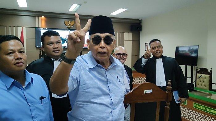 Pimpinan Ponpes Al Zaytun Indramayu, Panji Gumilang kembali mengacungkan dua jari usai sidang lanjutan di Pengadilan Negeri (PN) Indramayu