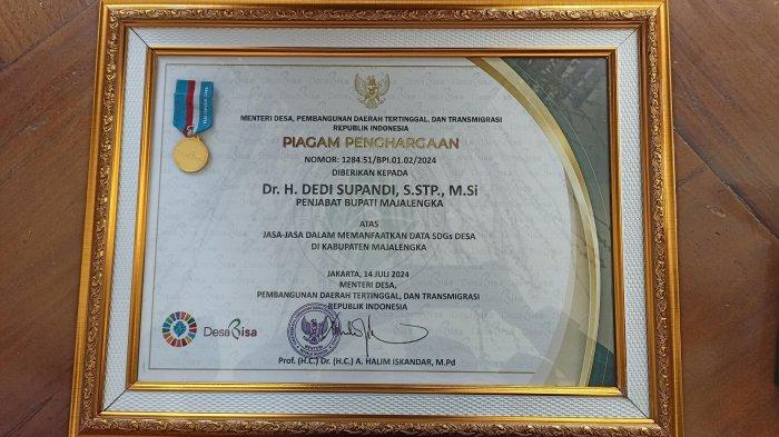 Penghargaan tersebut diberikan atas jasa-jasa dalam memanfaatkan data Sustainable Development Goals (SDGs) desa di Kabupaten Majalengka, sehingga mendapatkan satya lencana Bakti Inovasi Desa.