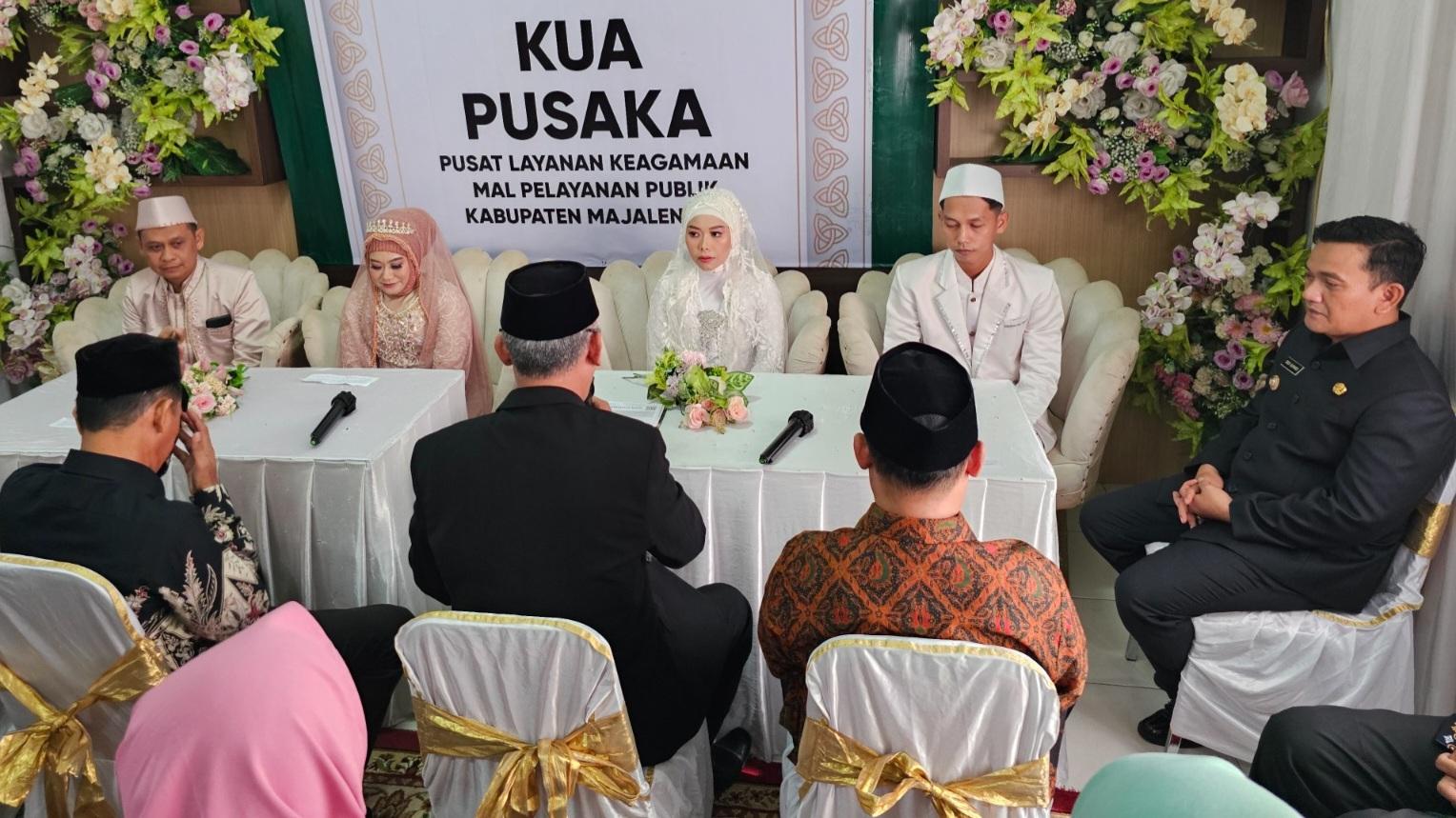 Dua pasangan pengantin itu melaksanakan akad nikah di KUA Pusat Layanan Keagamaan (Pusaka), salah satu fasilitas khusus yang disiapkan Kemenag Majalengka di MPP Kabupaten Majalengka.