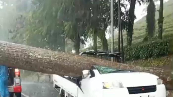 Sebuah mobil pick up bermuatan nanas tertimpa pohon besar saat melintas di tengah hujan deras disertai angin kencang.