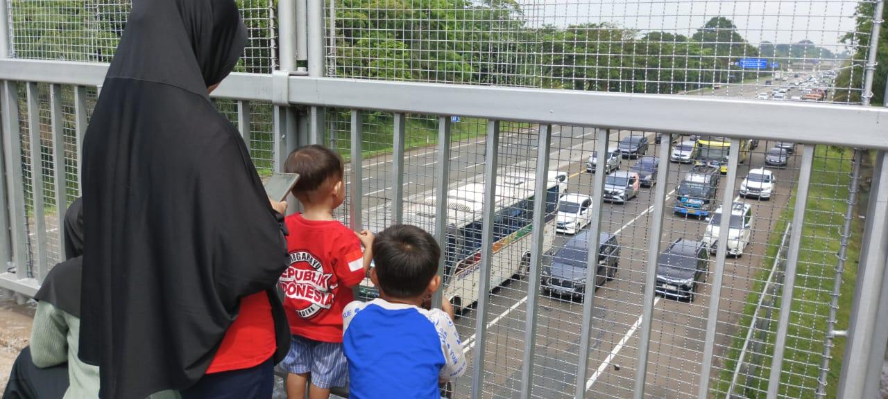 Warga berhenti di jembatan kawasan Tol Cipali atas keingin sang anak yang ingin melihat bus melintas dan kerap kali memberikan klakson 'telolet'.
