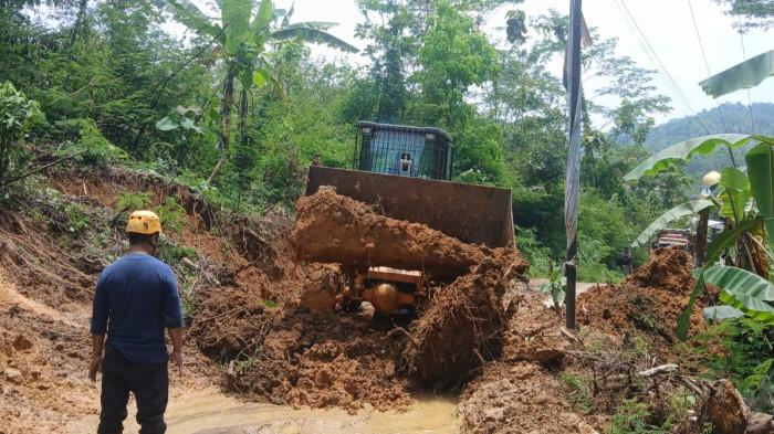 Akses jalan Pancatengah menuju Kecamatan Cikalong, Desa Kalapagenep, Kabupaten Tasikmalaya tertutup material longsor