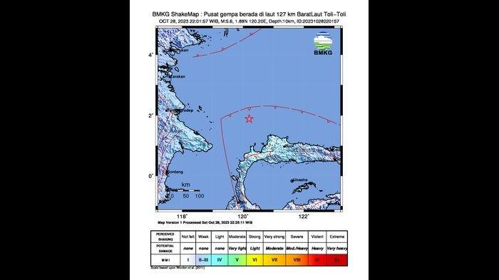 BMKG mencatat gempa bumi tersebut terjadi pada pukul 22.01 WIB. Pusat gempa berada di laut, 127 Km Barat Laut Toli-toli.